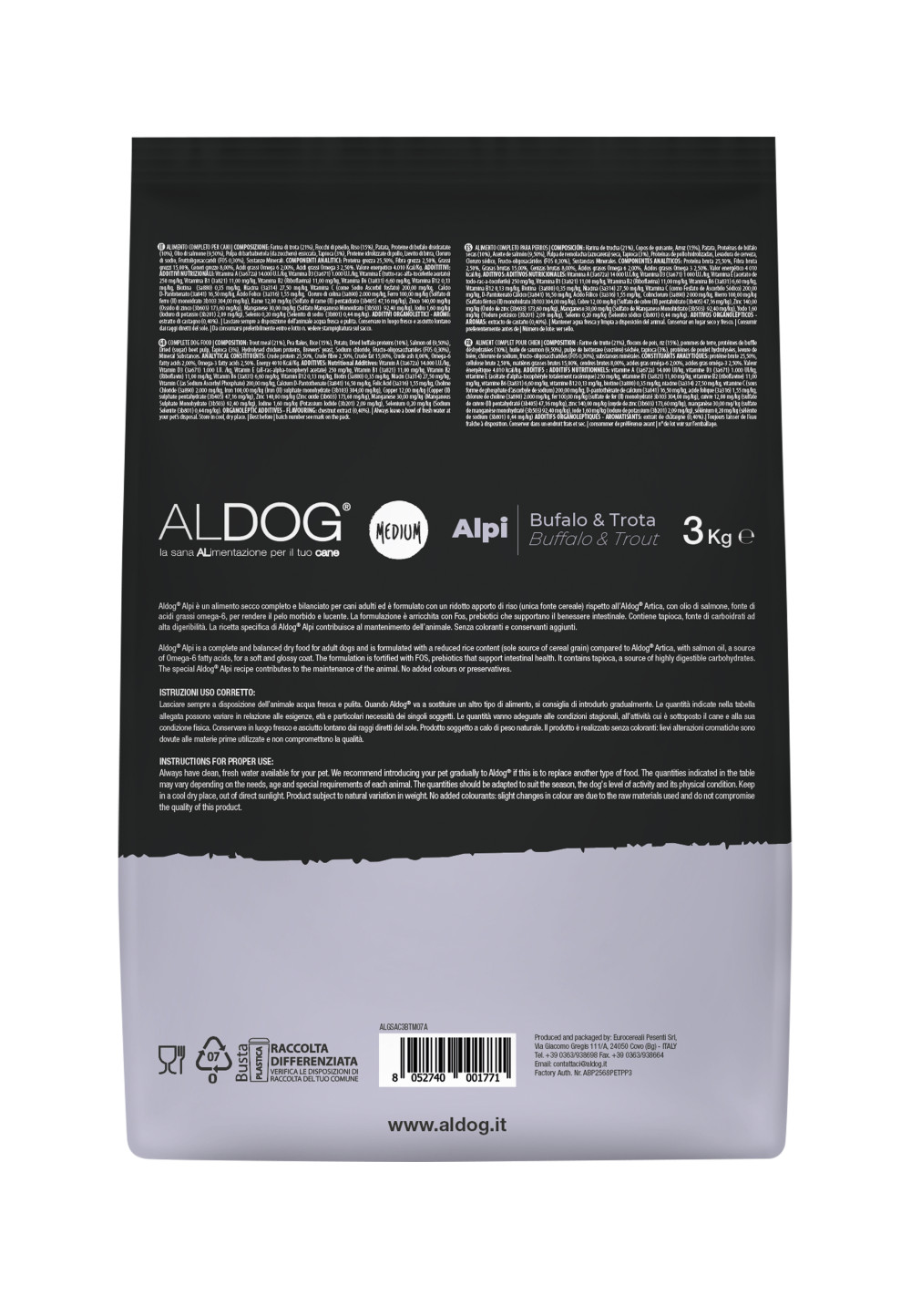 AZ ALDOG ALPI LOW GRAIN TELJES ÉRTÉKŰ, KIEGYENSÚLYOZOTT SZÁRAZELEDEL FELNŐTT KUTYÁK SZÁMÁRA, PISZTRÁNG ÉS BIVALYFEHÉRJÉVEL, CSÖKKENTETT RIZSBEVITELLEL (AZ EGYETLEN SZÉNHIDRÁTFORRÁSSAL) KÉSZÜLT, LAZACOLAJJAL, AMELY AZ OMEGA-6 ZSÍRSAVAK FORRÁSA, A PUHA ÉS FÉNYES SZŐR ÉRDEKÉBEN.